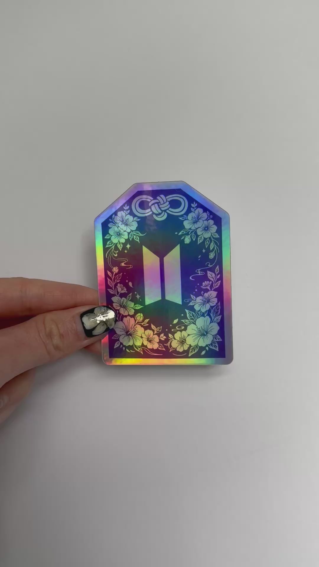 Shaped like an Omamori (Japanese good luck talisman), these stickers feature a Mugungwha (hibiscus) border - the National Flower of Korea as well as the BTS logo. The holographic effect is meant to mimic the style of traditional Korean mother of pearl lacquerware (Najeonchilgi) and are a great gift for any ARMY who love a modern and K-pop inspired twist on traditional asian art!